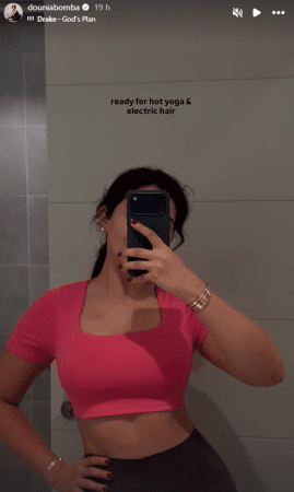 Dounia Al Ibrahim gave followers a glimpse into her routine with a fresh Instagram story that captured attention instantly. The Love Is Blind Habibi personality appeared in a mirror shot, fully prepared for a workout session, pairing style with discipline in a way that resonates strongly with audiences. Her caption, “ready for hot yoga & electric hair,” set the tone, signaling preparation, intention, and a commitment to personal care.