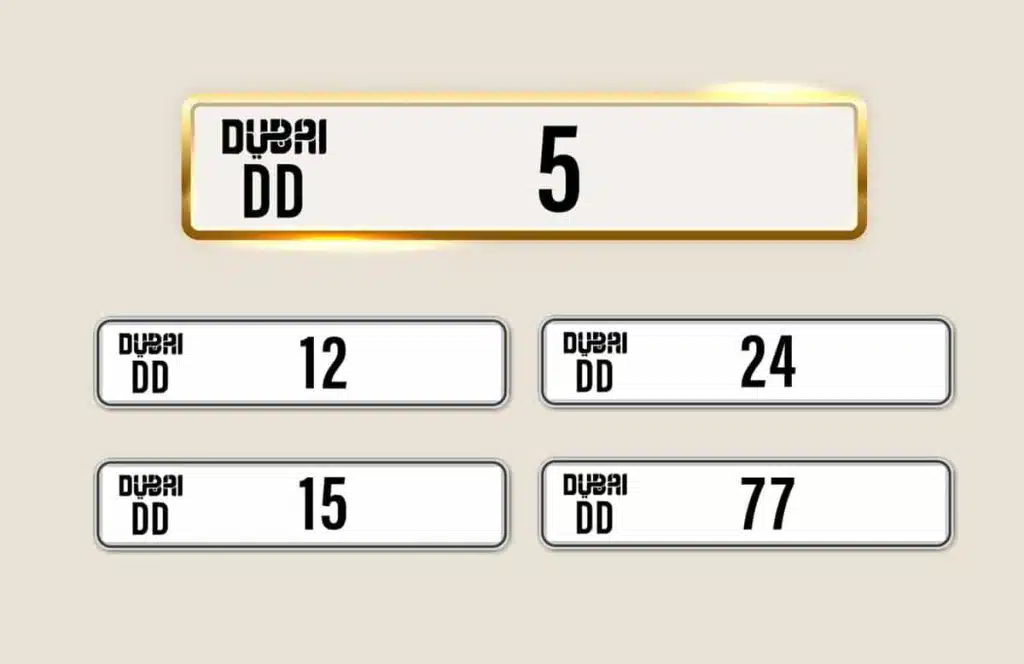 RTA offers five distinctive vehicle license tags with code DD as 77, 24, 15, 12 and 5 at auction.