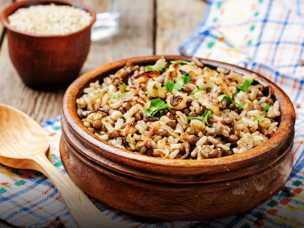 A comforting lentil and rice dish topped with caramelised onions.