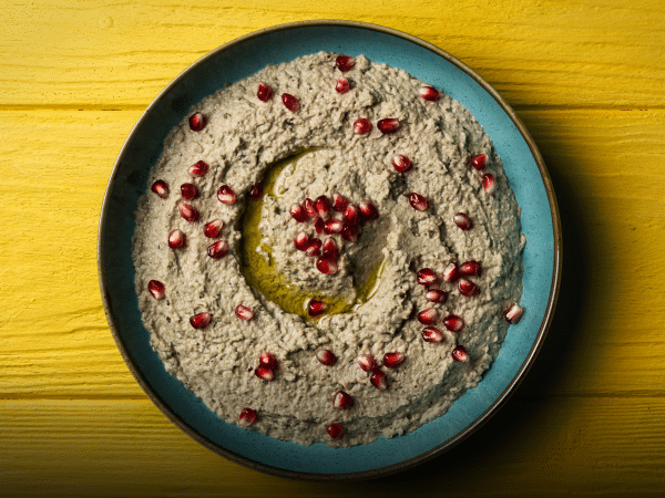 Roast aubergine until soft and slightly charred. Scoop out flesh, mash with tahini, garlic and lemon juice. Season and drizzle with olive oil before serving.