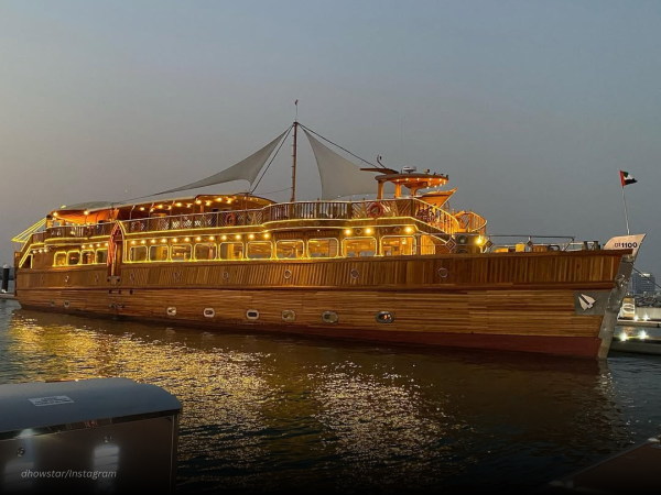 Rustar is promoted as the world’s largest floating restaurant. The traditional dhow measures 51 meters in length and accommodates up to 400 guests. It operates on Dubai Creek and serves multi-course dining experiences.