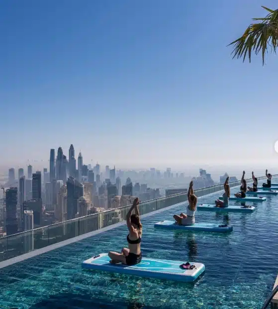 Exercising in the panoramic environment at the top of Dubai’s outdoor infinity pool. These floating yoga and Pilates classes offer you two hours of uninterrupted time in the pool, exercising while relaxing.