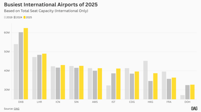 When domestic and international capacity are counted together, Hartsfield-Jackson Atlanta International Airport continues to hold the top global position with 63.1 million total seats in 2025. Dubai International Airport follows closely, separated by approximately 700,000 seats. The narrowing distance has drawn industry focus to how the rankings may shift as capacity strategies adjust. Growth patterns further define the picture. Atlanta recorded 1 percent year-on-year growth, while Dubai posted 4 percent growth during the same period. DXB’s total capacity now stands 16 percent above its 2019 level, according to OAG data. OAG has noted that Dubai is closing the gap within the overall rankings, placing attention on how long the current order may remain unchanged.