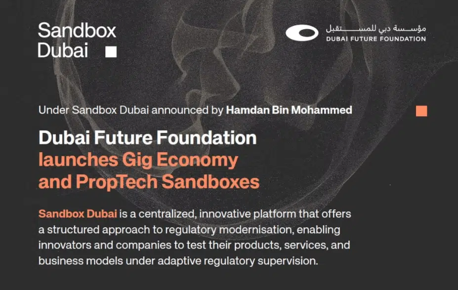 The Sandbox Dubai supports two new sandboxes introduced by Dubai Future Foundation (DFF): the gig economy and PropTech. An announcement was launched as part of the Dubai Economic Agenda (D33) to support the development of regulation, as well as to support the development of important sectors of the economy in Dubai.